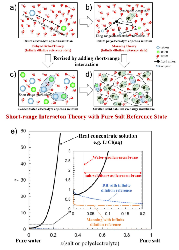 受Kenneth S. Pitzer濃電解質溶液理論啟發(fā),研究人員認為:離子交換膜的反離子凝聚效應相較曼寧理論所描述的稀聚電解質溶液要強的多;在純水溶脹的離子交換膜中,絕大多數(shù)的反離子處于凝聚狀態(tài),有效的屏蔽了聚合物鏈上的電荷。因此,自由離子之間的短程作用,而非長程靜電作用,才是決定性的。這點與忽略長程靜電作用的濃電解質溶液理論完全一致。據(jù)此,研究人員創(chuàng)新性提出了"純水溶脹膜參考態(tài)"——首次明確區(qū)分了膜內反離子與溶液相中反離子的標準化學勢。