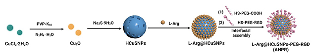 近日,中國科學(xué)院蘭州化學(xué)物理研究所天然藥物與化學(xué)測量研究中心海軍人才團隊與新疆大學(xué)合作,針對傳統(tǒng)抗腫瘤藥物遞送系統(tǒng)的局限性,發(fā)展了一種“高效靶向+刺激響應(yīng)+光熱協(xié)同”智能響應(yīng)抗腫瘤藥物遞送材料。研究人員通過將一氧化氮供體L-精氨酸(L-Arg)負載到具有近紅外吸收的中空硫化銅納米顆粒(HCuSNPs)中,并與腫瘤靶向肽(RGD)組裝,合成AHPR智能納米遞送材料。體外和體內(nèi)實驗表明,近紅外光激發(fā)下AHPR產(chǎn)生熱效應(yīng),誘導(dǎo)納米結(jié)構(gòu)降解并釋放銅離子和一氧化氮,提高血管通透性,促進藥物深度滲透。同時,協(xié)同觸發(fā)光熱治療、銅死亡及活性氧/活性氮風(fēng)暴,實現(xiàn)高效抗腫瘤效果(體積減少90%)。