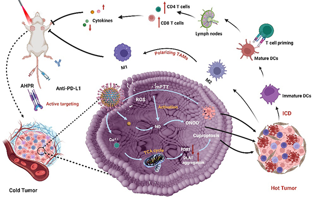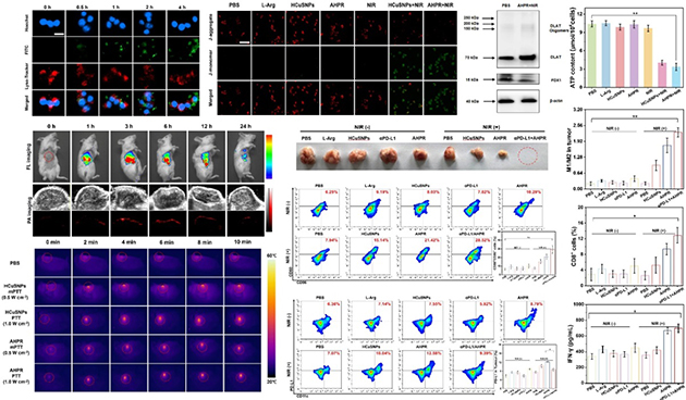 研究人員進一步利用熒光-光聲成像可視化技術(shù),揭示了智能響應(yīng)抗腫瘤藥物遞送體系的作用機制。結(jié)果表明,AHPR組裝腫瘤靶向肽,可主動識別并富集于腫瘤部位,實現(xiàn)高效靶向遞送。并在近紅外光激發(fā)下,通過溫和光熱、銅死亡和ONOO?產(chǎn)生等機制調(diào)控腫瘤免疫微環(huán)境,促進DCs成熟,增強T細胞的浸潤和巨噬細胞極化,誘導(dǎo)免疫原性細胞死亡,將“冷”腫瘤轉(zhuǎn)化為“熱”腫瘤。值得注意的是,AHPR可與免疫檢查點抑制劑(αPD-L1) 結(jié)合,進一步增強免疫應(yīng)答率,改善腫瘤治療效果。這一策略為抗腫瘤藥物智能遞送材料開發(fā)和多維腫瘤免疫治療提供了新思路。