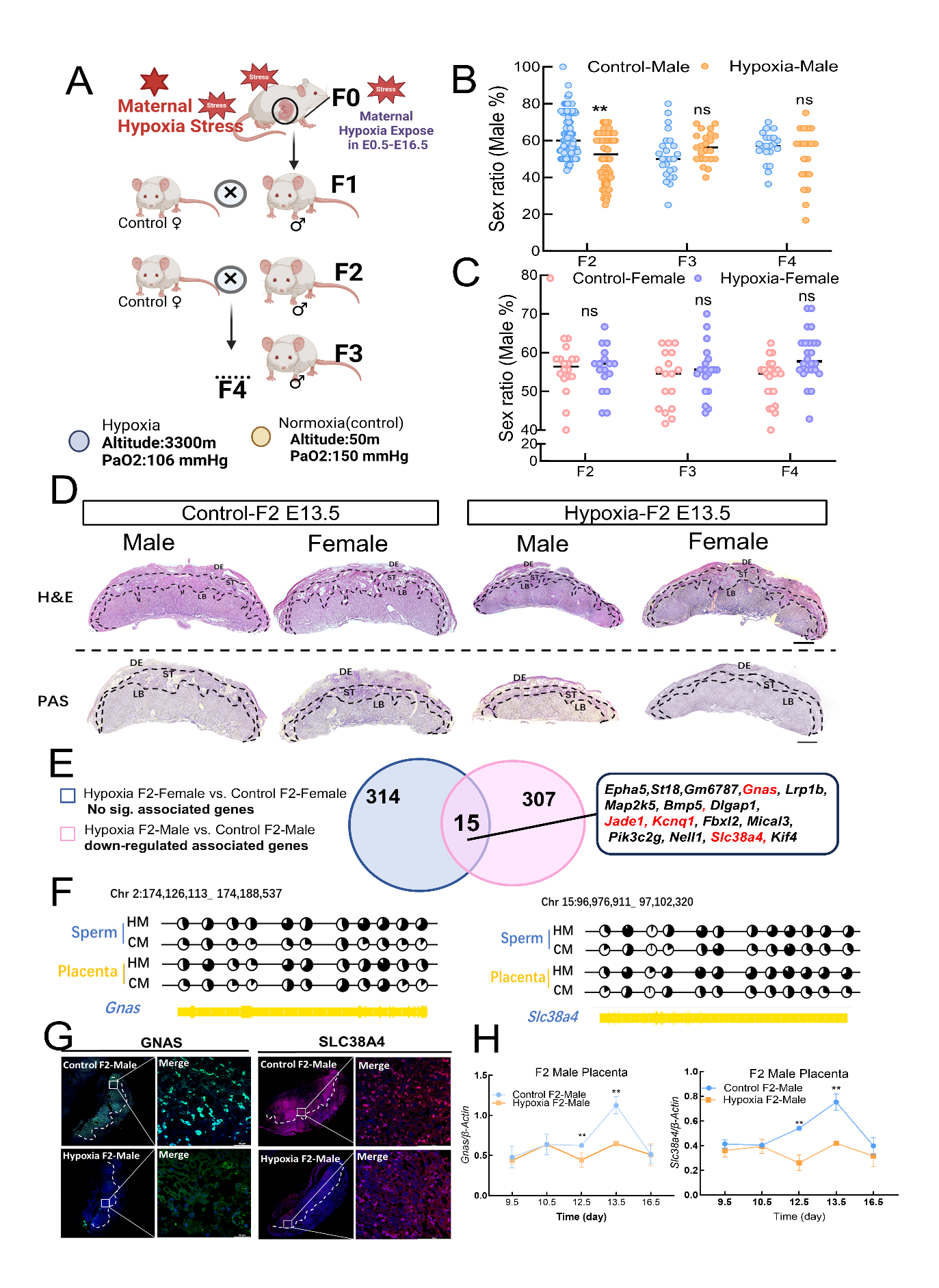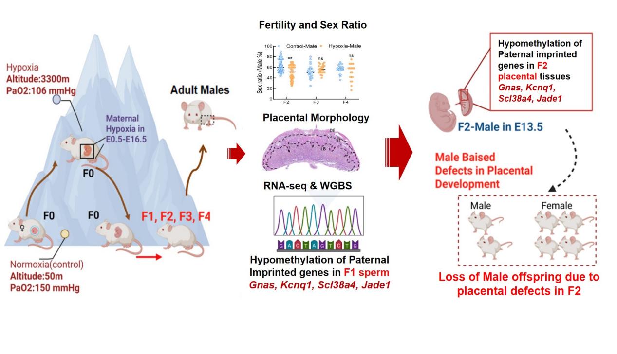 為探究母體低氧環(huán)境暴露對子代的跨代影響,中國科學院西北高原生物研究所動物生態(tài)與資源保護研究團隊建立了孕期低氧暴露小鼠模型,將經歷過孕期低氧暴露的小鼠(F0)轉運至低海拔后,出生的雄性小鼠和對照雌鼠合籠,連續(xù)飼養(yǎng)四代(F1-F4)。從2018年 9月到 2023年 8月,通過大量出生性別統(tǒng)計和不同發(fā)育階段的性別鑒定,發(fā)現(xiàn)母體孕期低氧暴露會造成F2代雄性個體顯著減少。進一步的分析發(fā)現(xiàn)F2雄性減少是由于在胚胎期13.5天發(fā)生的胚胎特異性丟失。雄性胚胎丟失的主要原因為胎盤形態(tài)和功能異常。研究團隊通過胎盤轉錄組和全基因組DNA甲基化測序聯(lián)合分析,發(fā)現(xiàn)父源印記基因Slc38a4,Gnas,Jade1 和Kcnq1表達異常。隨后,通過對F1代小鼠成熟精子與F2代雄性胎盤全基因組DNA甲基化進行聯(lián)合分析,結果發(fā)現(xiàn)以上印記基因DNA甲基化模式高度相似。這說明經歷胚胎期低氧的F1代雄性小鼠的精子存在甲基化異常,并且可以進一步影響F2雄性個體生長發(fā)育進而導致性別比例異常。該工作系統(tǒng)地揭示母體低氧暴露對F1及F2代發(fā)育影響的跨代遺傳機制,為深入理解高原低氧暴露的生殖和健康風險提供了新的表型數(shù)據(jù)。