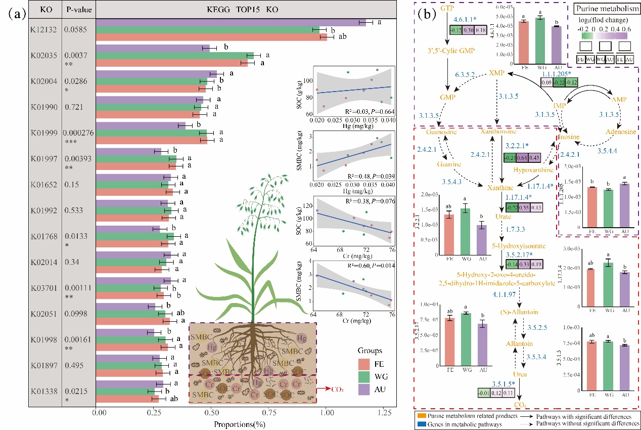 針對(duì)這一問題,中國(guó)科學(xué)院西北高原生物研究所三江源草原生態(tài)系統(tǒng)國(guó)家觀測(cè)研究站團(tuán)隊(duì)在青藏高原祁連山南麓選擇了圍封(FE)、冬季放牧(WG)和開墾(AU)3種不同干擾的草地管理措施為研究對(duì)象,探明了微生物群落結(jié)構(gòu)和功能如何響應(yīng)因草地管理引起的植被群落和PTEs的變化,以及對(duì)它們的調(diào)控路徑。研究結(jié)果表明,草地管理措施改變了地上禾本科和豆科植被群落的結(jié)構(gòu)及地下生物量的分配,導(dǎo)致K的分布變化,進(jìn)而引起真菌群落結(jié)構(gòu)和氮代謝酶的顯著變化。Cr和Hg與微生物相互作用影響SOC和SMBC的代謝過程,可能對(duì)高寒草甸固碳具有一定積極作用,并且高寒草甸對(duì)PTEs具有良好的抗性。適度干擾的冬季放牧(WG)有利于維持高寒草地微生物群落結(jié)構(gòu)和功能的穩(wěn)定性。本研究為青藏高原祁連山高寒草甸的改善提供科學(xué)依據(jù)。