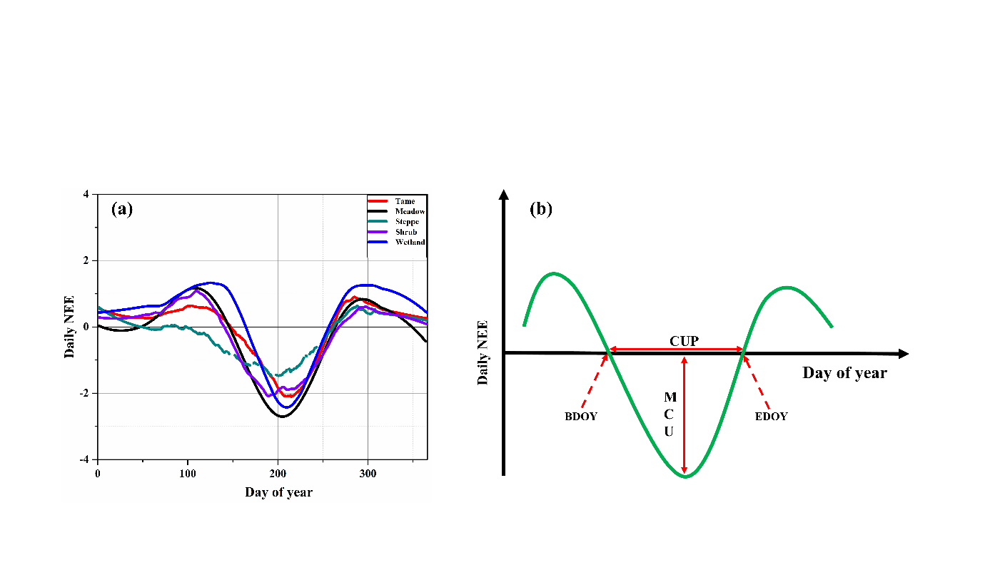 青藏高原因獨特地形被譽為地球"第三極",其 146 萬km2的高寒草地生態(tài)系統(tǒng)是重要碳匯,碳同化能力的季節(jié)及年際變化受氣候因子調(diào)控。該區(qū)域草地碳固存過程分為碳吸收期與碳排放期,但兩個時期對凈生態(tài)系統(tǒng)碳交換(NEE)年際變異的相對貢獻一直未明確。加之青藏高原偏遠地區(qū)碳通量觀測數(shù)據(jù)匱乏且存在共享限制,不同類型高寒草地碳吸收周期時長、碳吸收速率及其控制因素尚不明晰,制約了對高原碳循環(huán)機制的認知。