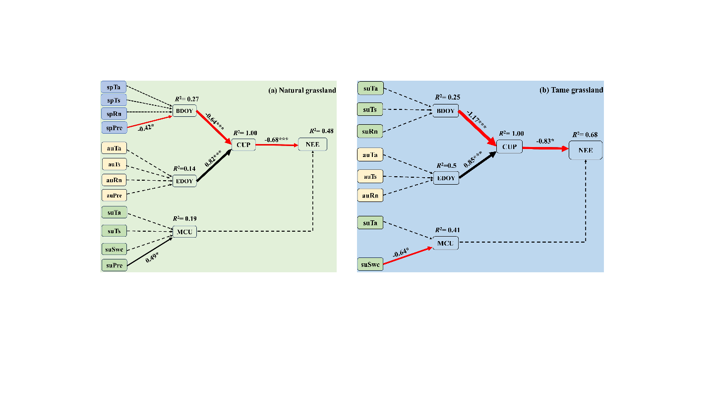 通過研究發(fā)現(xiàn),NEE 年際變異中 38% 的貢獻來自 CUP, MCU貢獻 18%,證實延長碳吸收周期對增強碳匯的效應(yīng)優(yōu)于提升最大碳吸收速率。同時,天然草地CUP起始日期受春季降水顯著驅(qū)動,春季降水成為啟動碳吸收周期的關(guān)鍵"扳機";夏季水分可利用性對天然草地 MCU 呈負向調(diào)節(jié),卻能促進人工草地 MCU 提升。人類管理措施(如播種、收割)主導(dǎo)人工草地 CUP 動態(tài),其碳吸收周期(106 天)較天然草地縮短約 30 天,直接影響 NEE 年際波動。生態(tài)系統(tǒng)對比顯示,高寒草原雖擁有最長 CUP(147 天),但碳吸收強度最低;高寒濕地以最高 MCU(-5.02 g C m?2 d?1)成為高原最強"碳匯熱點"。此外,冬季生態(tài)系統(tǒng)呼吸占全年總量 15%,主要受降雪量和凈輻射調(diào)控;CUP 持續(xù)時間由早期降水和草地類型共同決定,是導(dǎo)致 NEE 年際變異及生態(tài)系統(tǒng)差異的核心因素。未來將聚焦氣候異常對 CUP 和 MCU 的影響機制,進一步完善高原碳匯動態(tài)預(yù)測模型,為全球變化背景下的生態(tài)安全保障提供科技支撐。
