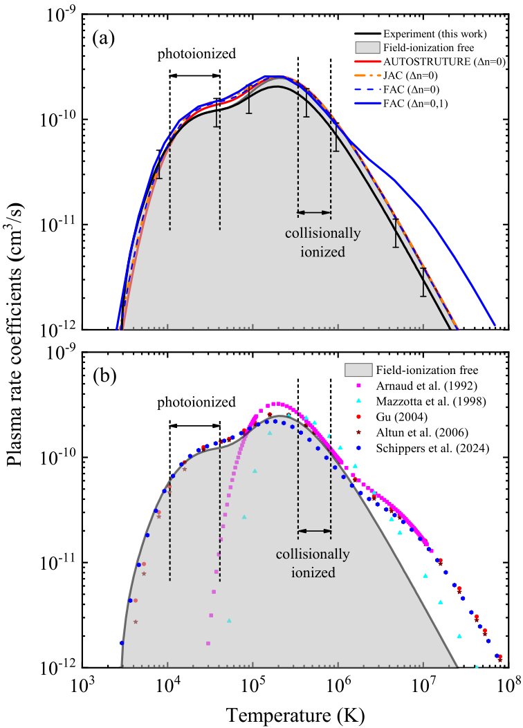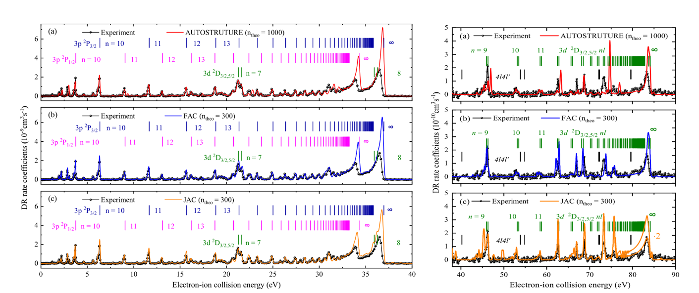 基于蘭州重離子加速器冷卻儲存環(huán)開展的高電荷態(tài)離子的雙電子復合精密譜學實驗具有較高的能量分辨,且其電子-離子相對能量可大范圍精密調制,是目前唯一能夠精確測量低能碰撞復合截面關鍵數據的實驗方法??蒲袌F隊在對M殼層類鈉鐵離子 Fe15+的實驗中,成功測量了 0-90 eV 能量范圍內的復合速率系數。他們將實驗結果與最新的理論Flexible Atomic Code (FAC) 、AUTOSTRUCTURE、Jena Atomic Calculator (JAC)計算的結果仔細對比,解析出每個共振結構的來源。同時,科研人員從雙電子復合速率系數得到了可用于等離子體建模的等離子體速率系數,并與此前的理論數據作了對比研究。