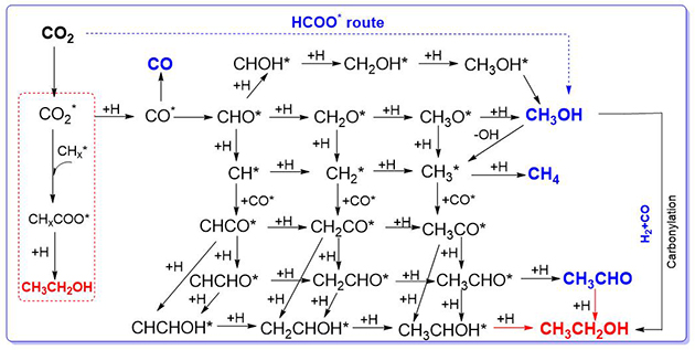 圖1.CO2加氫合成C2+OH的反應網(wǎng)絡。