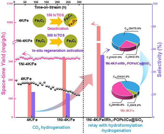 中國科學院蘭州化學物理研究所低碳催化與二氧化碳利用全國重點實驗室可再生碳資源催化轉化組在前期Ni催化CO2加氫合成C2+OH(Angew. Chem. Int. Ed.,2023,DOI: https://doi.org/10.1002/anie.202311335.)和多相催化烯烴氫甲?;铣扇?/span>J. Catal. 2025,DOI: 10.1016/j.jcat.2025.116095;J. Org. Chem,2023,DOI:?10.1021/acs.joc.2c02105等)的研究基礎上,研究人員一方面構建了Ni-K共修飾的Fe基催化劑(1Ni-4K/Fe),將CO2加氫生成C2+OH的時空收率(STY)提高到317.0 mg/g/h,并且能在300h內(nèi)穩(wěn)定運行;另一方面利用接力催化思想,構建了“CO2加氫-烯烴氫甲?;?醛氫化”(1Ni-4K/Fe||Rh1/POPs||Cu@SiO2)的三串聯(lián)體系,將產(chǎn)物中烯烴進一步轉化為醇,實現(xiàn)C2+OH的時空收率達到980.5 mg/g/h,選擇性可達55.0%,而且由于氫甲?;脑鎏甲饔茫?/span>C2+OH中C3+OH的占比可達75.6%,顯著提升碳的利用率。