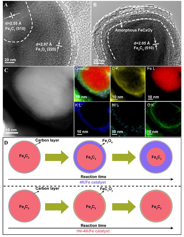 圖3.反應后4K/Fe(A)和4K-1Ni/Fe(B)催化劑的HRTEM結果;(C)反應后4K-1Ni/Fe催化劑EELS元素分布;(D)4K/Fe與4K-1Ni/Fe催化劑的結構演變。
