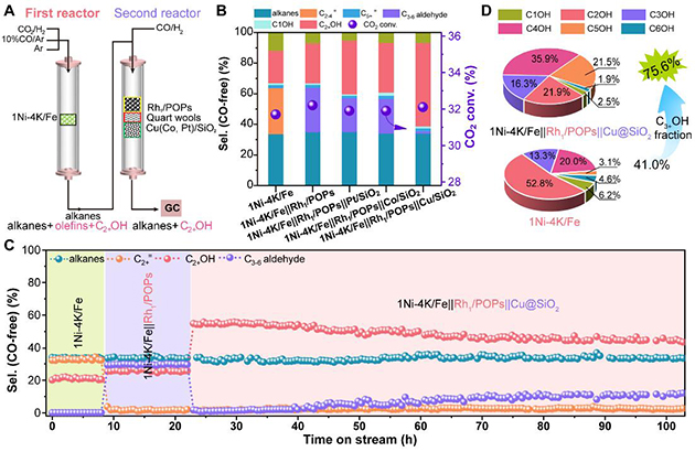 圖2. K-Ni共修飾Fe基催化劑及兩段三催化劑串聯(lián)體系的催化CO2加氫合成C2+OH。