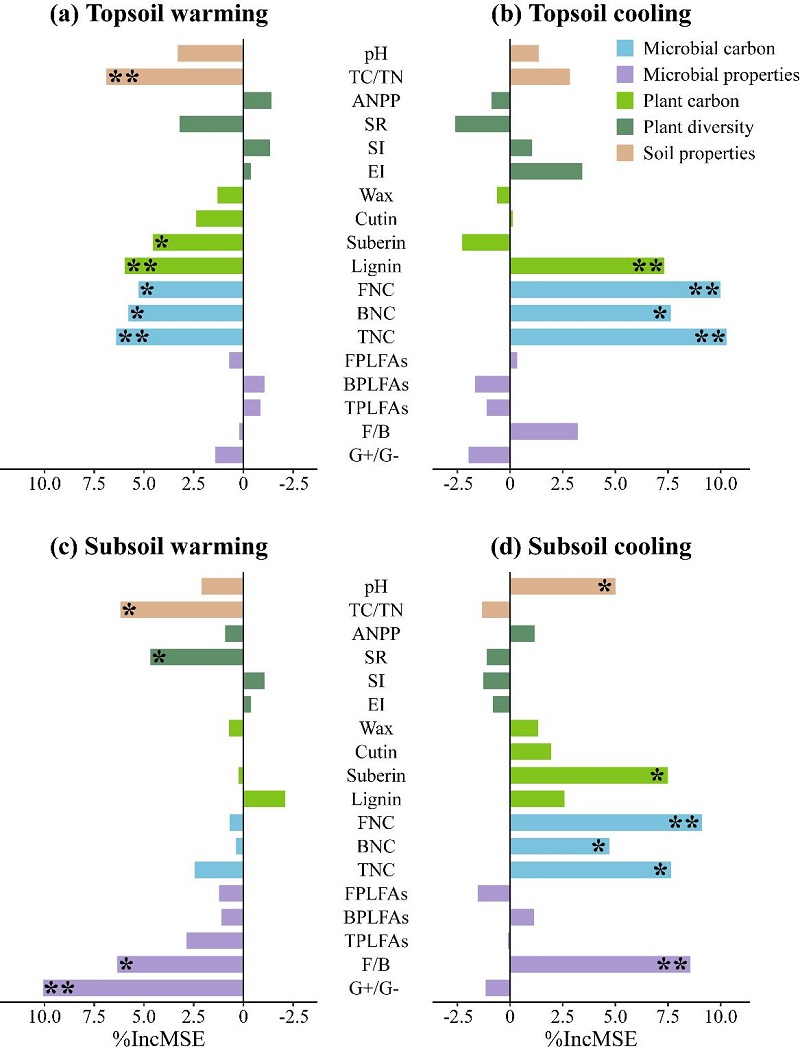 該研究成果于2025年7月15日以?Responses of subsoil organic carbon to climate warming and cooling is determined by microbial community rather than its molecular composition?為題發(fā)表在生態(tài)學(xué)頂級(jí)學(xué)術(shù)期刊?Ecology Letters(中國(guó)科學(xué)院1區(qū)TOP,五年IF=9.4)。西北高原所博士研究生李宇章為第一作者,張振華研究員為通訊作者。中國(guó)科學(xué)院青藏高原研究所汪詩(shī)平研究員、北京大學(xué)賀金生教授與朱彪教授、蘭州大學(xué)井新教授、青海大學(xué)趙新全教授、四川師范大學(xué)胡宜剛教授等也參與了研究。該研究得到了西部之光-重點(diǎn)實(shí)驗(yàn)室專(zhuān)項(xiàng)?交叉團(tuán)隊(duì)項(xiàng)目、國(guó)家自然科學(xué)基金面上項(xiàng)目和第二次青藏高原科學(xué)考察項(xiàng)目的資助。