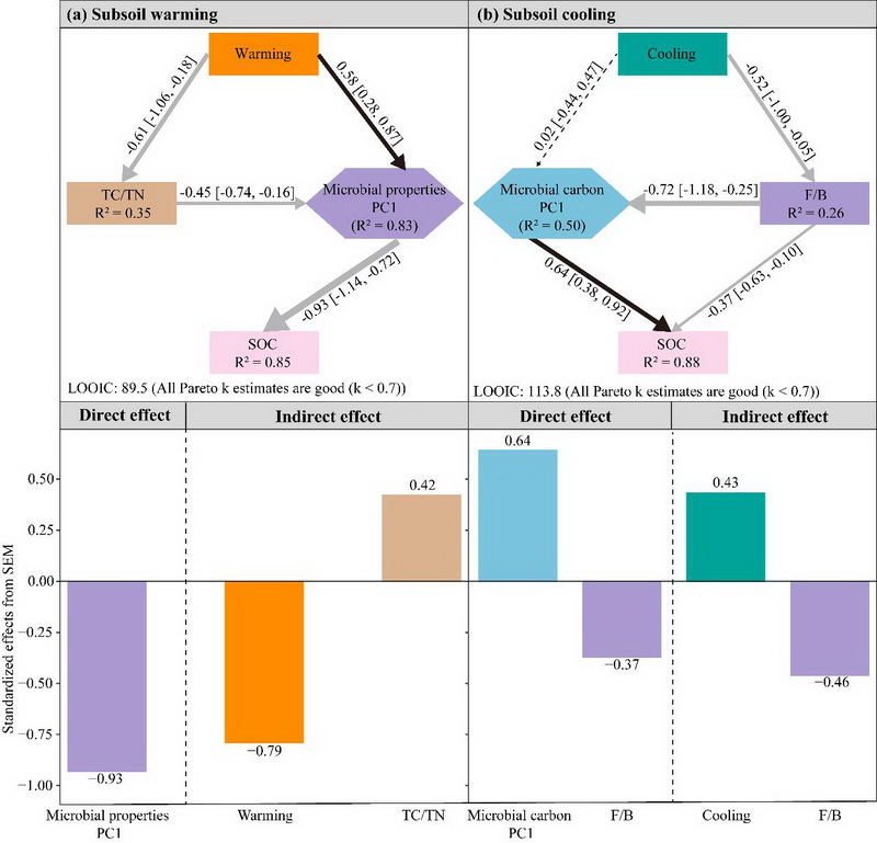 研究發(fā)現(xiàn),高寒草甸亞表層土壤有機(jī)碳對(duì)增溫、降溫的響應(yīng)較表層更為敏感,無(wú)論是增溫還是降溫,均未引起亞表層土壤中植物和微生物源碳組分的顯著變化。然而,增溫使真菌與細(xì)菌生物量比值(F/B)和革蘭氏陽(yáng)性細(xì)菌與革蘭氏陰性細(xì)菌生物量比值(G+/G-)分別增加15.0%和8.6%,而降溫則使其分別降低4.5%和9.6%。進(jìn)一步分析發(fā)現(xiàn),增溫主要通過(guò)增加F/B和G+/G-直接減少土壤有機(jī)碳庫(kù)的積累,同時(shí)降低土壤碳氮比間接減少亞表層土壤有機(jī)碳含量,而降溫則主要通過(guò)降低F/B增加亞表層土壤有機(jī)碳含量。如果只考慮增溫而不考慮降溫的作用,傳統(tǒng)的增溫控制實(shí)驗(yàn)可能會(huì)低估氣候變暖對(duì)高寒草地亞表層土壤有機(jī)碳庫(kù)的消極作用。該研究為更好地解釋和預(yù)測(cè)未來(lái)氣候變化背景下高寒草地生態(tài)系統(tǒng)土壤碳庫(kù)的形成與變化提供了新的理論依據(jù)。