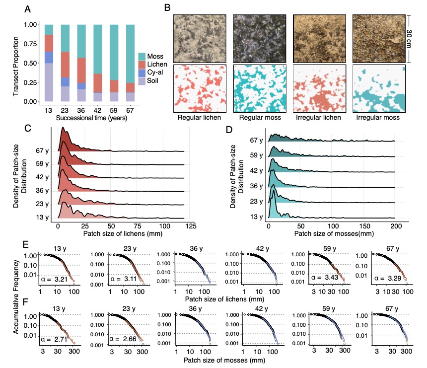 研究團(tuán)隊(duì)采用了計(jì)算建模與全局-局部耦合的野外調(diào)查相結(jié)合的研究方法。理論建?;诟怕实脑詣?dòng)機(jī)(Cellular automaton)模型的開發(fā),模擬了地衣和蘚類斑塊的動(dòng)態(tài)變化。野外觀測(cè)在中國科學(xué)院沙坡頭沙漠試驗(yàn)研究站進(jìn)行,通過在不同演替階段的人工固沙植被帶中設(shè)置樣線,記錄了生物結(jié)皮的覆蓋度、組成和斑塊大小分布。研究通過對(duì)冪律分布的擬合,從全局尺度檢測(cè)主導(dǎo)生物結(jié)皮動(dòng)態(tài)的反饋模式。通過不同演替階段和不同斑塊大小下生物結(jié)皮斑塊中心與邊緣之間的生長(zhǎng)差異比較,從斑塊尺度驗(yàn)證局部自組織過程,對(duì)比模擬結(jié)果揭示了生物結(jié)皮自組織機(jī)理及其生態(tài)意義。