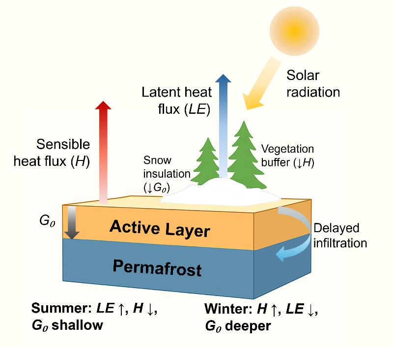 青藏高原是全球最大的高海拔多年凍土區(qū),長期以來的研究多集中于其碳循環(huán)功能。在全球變暖背景下,其在能量與水分耦合過程中的作用正在被重新認(rèn)識。多年凍土不僅是全球最大的高海拔“碳庫”,更通過調(diào)控地表能量分配和水分循環(huán),深刻影響青藏高原乃至全球的氣候格局。