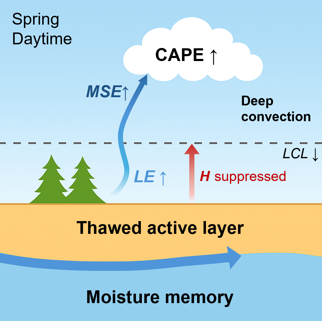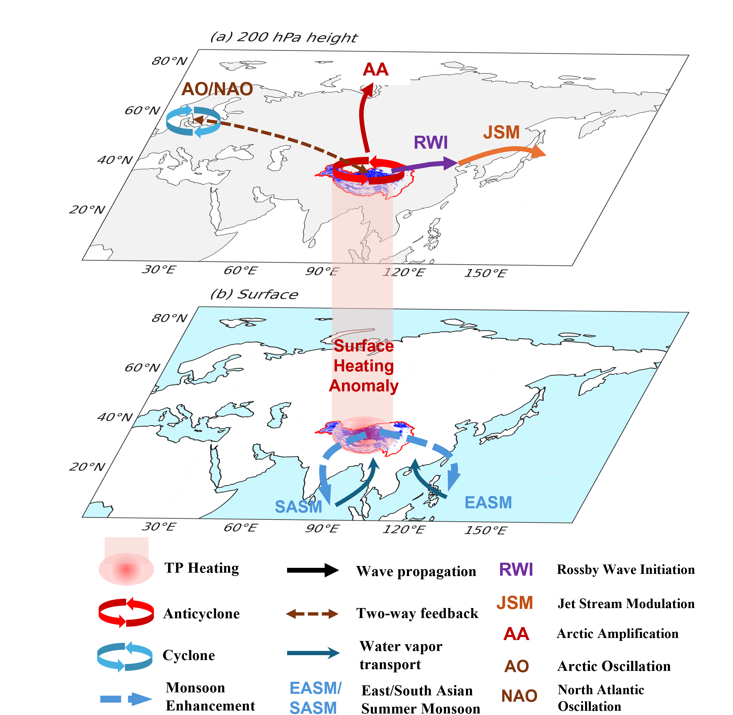 研究團(tuán)隊依托長期野外觀測、遙感反演和過程模擬,完整描繪了“地表能量分配→邊界層演變→季風(fēng)與行星波響應(yīng)”的多尺度反饋鏈條。結(jié)果表明,多年凍土的“凍融記憶”,即凍結(jié)或融化狀態(tài)在季節(jié)間延續(xù)并影響后續(xù)熱量與水分過程,并對土壤熱物理特性及潛熱/顯熱分配造成影響,共同決定了能量釋放的節(jié)奏與路徑,進(jìn)而影響邊界層穩(wěn)定性、對流觸發(fā)和大氣遙相關(guān)結(jié)構(gòu)。