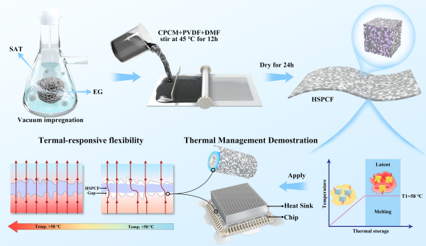 青海鹽湖所溶液結(jié)構(gòu)與界面課題組研究團(tuán)隊(duì)以三水醋酸鈉(SAT)作為相變材料,多孔膨脹石墨構(gòu)建封裝空間,設(shè)計(jì)了一種無(wú)機(jī)相變薄膜。通過膨脹石墨在不同方向?qū)娱g交聯(lián)形成3D多孔支撐骨架構(gòu)建“熱橋”,實(shí)現(xiàn)熱量多維度傳遞。并且當(dāng)電子器件臨界熱失控,相變薄膜主動(dòng)儲(chǔ)存熱量,該“熱傳導(dǎo)+熱吸收”的雙重?zé)峁芾頇C(jī)制有效緩沖電子器件瞬時(shí)熱通量,且PVDF的引入使相變薄膜獲得熱誘導(dǎo)柔性、良好的阻燃與電絕緣性能。研究結(jié)果使熱失控電池模塊溫度降低10?℃,CPU表面溫度降低20?℃。