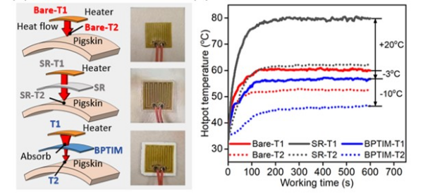 基于雙連續(xù)相變熱界面材料模擬可穿戴電子器件皮膚熱管理示意圖及不同狀態(tài)下發(fā)熱電子元件引起皮膚(模擬)表面溫度變化情況比較