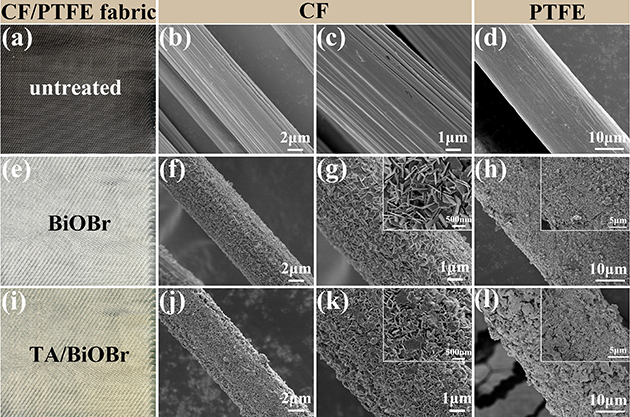 眾所周知,CF和PTFE纖維表面具有強化學惰性,導致其復合材料的界面結合性能差。在上述工作進行摩擦學性能評價的過程中,存在大量纖維與樹脂基體脫黏拔出的現(xiàn)象,對復合材料的整體性能的發(fā)揮產(chǎn)生不利影響。近日,研究團隊基于前期研究基礎,在界面優(yōu)化改性方面提出了新思路。團隊首次將BiOBr應用于摩擦學領域,并提出了“軟-硬-軟”多級結構的設計思路,通過化學浴、水熱生長和層層自組裝方法在CF/PTFE織物表面依次構建了化學交聯(lián)的“軟”基底層(PEI/PA)、垂直取向的“硬”中間層(BiOBr納米片)以及動態(tài)配位的“軟”外層(TA/Fe3+金屬-多酚網(wǎng)絡)。其改性前后的纖維表面形貌如圖1所示。