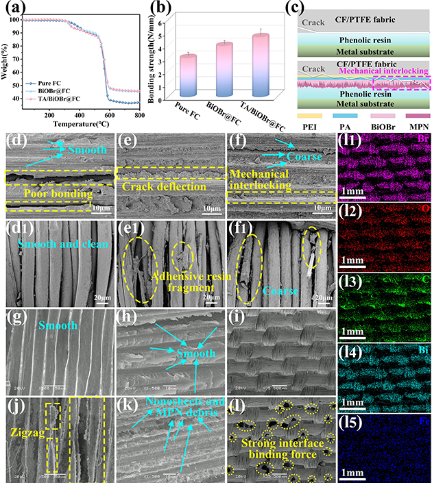 圖3.CF/PTFE纖維織物復合材料的TGA曲線(a)、粘結強度(b)和界面增強機理(c);純FC、BiOBr@FC和TA/BiOBr@FC剝離后織物截面上CF(d-f)和PTFE纖維(d1-f1)的SEM圖像;Pure FC(g-i)和TA/BiOBr@FC(j-l)剝離后金屬基板表面的SEM圖像;l的相應元素映射(l1-l6)