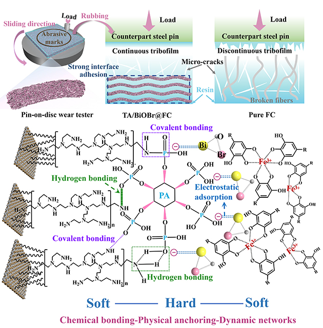 團隊人員在此基礎上提出了在纖維織物表面構建“軟-硬-軟”結構增強復合材料的摩擦學性能的磨損機理。未經(jīng)改性的復合材料在受到外部擠壓和剪切力的作用下,出現(xiàn)大量的微裂紋并伴隨纖維嚴重拔出斷裂,隨后在對偶表面形成不均勻不連續(xù)的摩擦膜。而TA/BiOBr@FC經(jīng)由表界面改性,織物界面從微觀到宏觀形成了化學鍵合-物理錨定-動態(tài)網(wǎng)絡的多級增強體系,避免纖維-樹脂界面脫黏和纖維拔出,顯著提升了CF/PTFE纖維織物復合材料的界面性能和摩擦學性能。