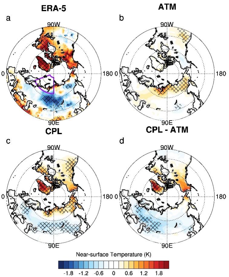 從ERA-5再分析資料(a)、僅考慮大氣過程的大氣模式試驗(b)及包含海-氣耦合過程的全耦合模式試驗(c)得到的歷史時期海冰消融導致的冬季地表氣溫異常(K)。(d)為全耦合模式試驗與大氣模式試驗結(jié)果之差