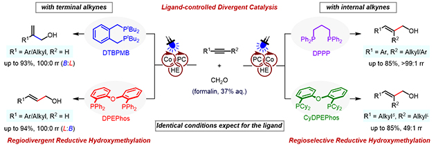 研究人員采用甲醛水溶液作為低成本的C1源,在藍(lán)光激發(fā)下,以4CzPN作為光催化劑、CoBr2為金屬催化劑,并借助Hantzsch酯與水作為復(fù)合氫源,在室溫條件下實(shí)現(xiàn)了烯丙醇類(lèi)化合物的高效合成。該體系的突出優(yōu)勢(shì)在于可通過(guò)配體調(diào)控靈活實(shí)現(xiàn)產(chǎn)物結(jié)構(gòu)的多樣化,當(dāng)使用DTBPMB作為配體時(shí),反應(yīng)高選擇性地生成支鏈型烯丙醇;而換用DPEPhos配體,則可高效獲得線性烯丙醇產(chǎn)物。此外,若采用DPPP或CyDPEPhos為配體,該催化體系還能以?xún)?yōu)良的選擇性實(shí)現(xiàn)芳基/烷基內(nèi)炔與甲醛的羥甲基化反應(yīng),展現(xiàn)出良好的官能團(tuán)適應(yīng)性和合成應(yīng)用潛力。機(jī)理研究表明,該反應(yīng)經(jīng)歷了低價(jià)鈷物種與甲醛和炔烴發(fā)生氧化環(huán)化,生成氧雜五元環(huán)鈷中間體然后質(zhì)子化的過(guò)程。