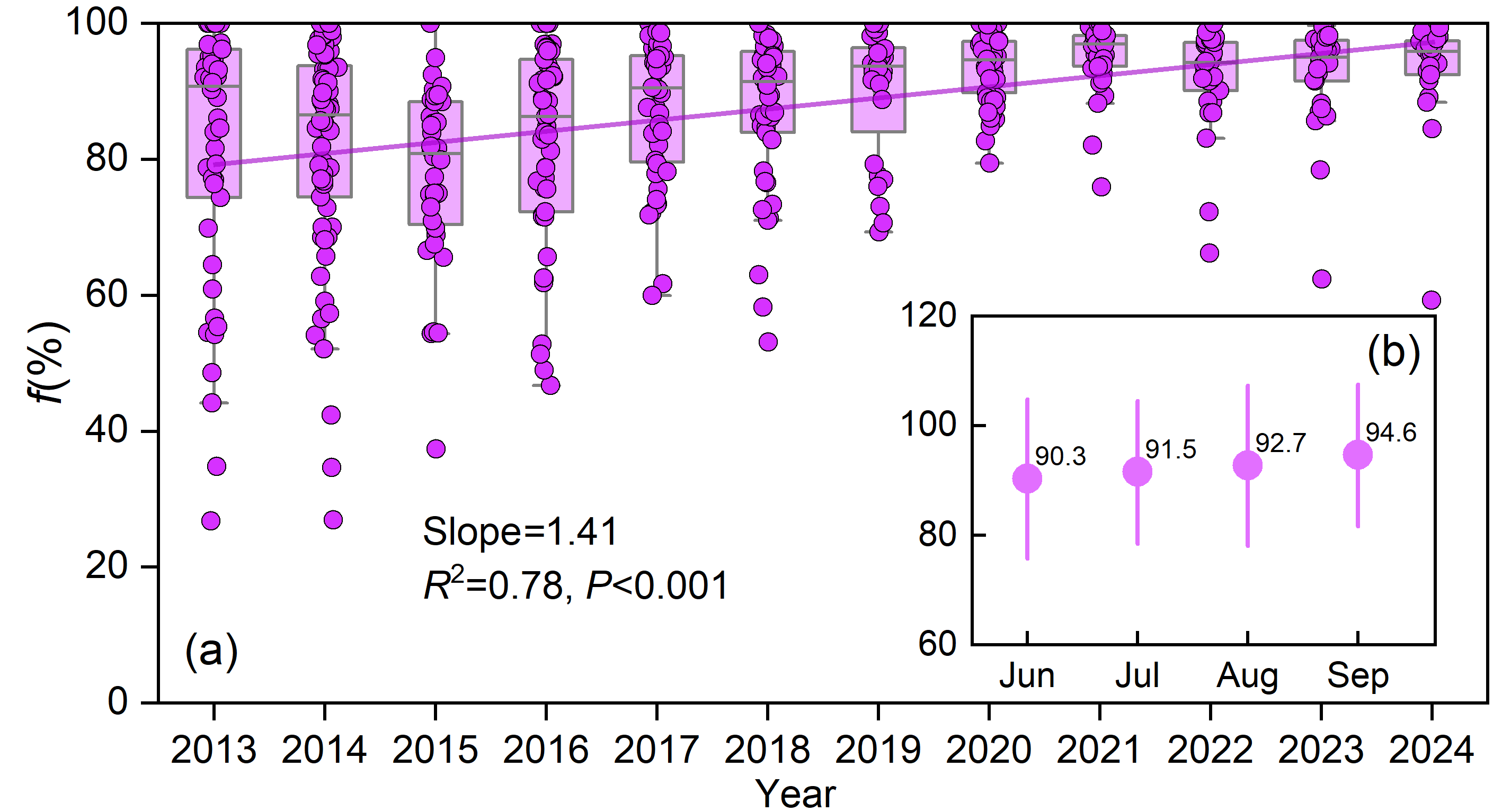 2013至2024年研究區(qū)剩余雨滴組分的時(shí)間變化趨勢(a) 年際變化(b) 月度變化