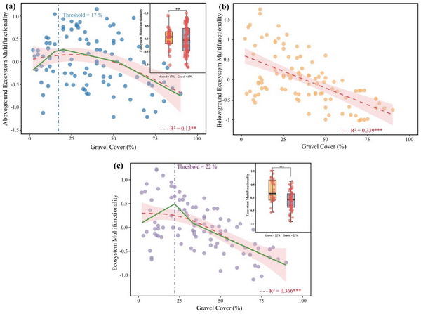 研究發(fā)現(xiàn),隨著礫石覆蓋度的增加,草地植物物種豐富度、功能群組成及生物量顯著下降,尤其是地下生物量的減少最為明顯;土壤含水量、孔隙度及養(yǎng)分含量顯著降低,而容重顯著升高,導(dǎo)致生態(tài)系統(tǒng)整體功能衰退。礫石化不僅直接抑制植物生長(zhǎng),還通過(guò)削弱土壤養(yǎng)分供給間接降低生態(tài)系統(tǒng)多功能性。隨機(jī)森林與結(jié)構(gòu)方程模型分析進(jìn)一步揭示,土壤養(yǎng)分和植物多樣性是決定生態(tài)系統(tǒng)多功能性的關(guān)鍵調(diào)控因子。隨礫石化程度加劇,地上功能指數(shù)(AEMF)和地下功能指數(shù)(BEMF)均顯著下降,后者的響應(yīng)更為敏感,當(dāng)?shù)[石覆蓋度超過(guò)22%時(shí),生態(tài)系統(tǒng)多功能性(EMF)出現(xiàn)明顯突變性下降,表明該閾值可作為高寒草地退化的早期預(yù)警指標(biāo)。研究指出,高寒草地礫石化退化過(guò)程會(huì)破壞植物-土壤耦合關(guān)系,導(dǎo)致生態(tài)功能的同步退化。