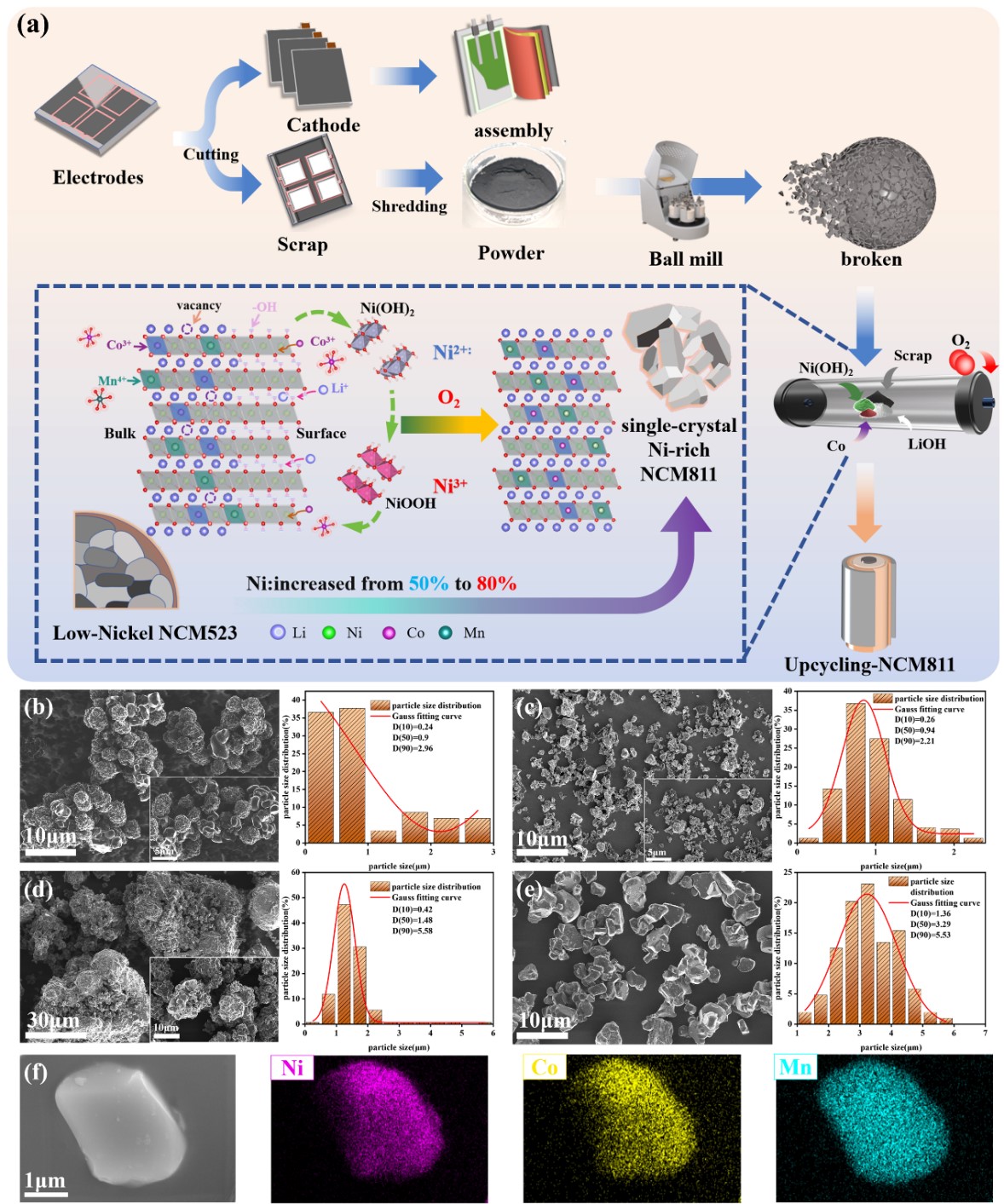 近日,中國科學院青海鹽湖研究所相變儲能課題組李翔副研究員提出一種針對低鎳、異質(zhì)三元正極混合廢料(如NCM523)的修復再生技術,成功將其轉(zhuǎn)化為鎳梯度分布的單晶NCM811正極材料,實現(xiàn)了廢料的高值化利用與性能超越。該研究系統(tǒng)揭示了三元正極混合廢料在修復再生過程中的動態(tài)重構路徑。研究發(fā)現(xiàn),由于混合廢料中不同尺寸顆粒在空氣中存儲時失效程度存在顯著差異,尤其是小粒徑顆粒更易受到空氣侵蝕,造成更深層次的晶格鋰損失和鹽巖相變,這為直接再生帶來巨大挑戰(zhàn)。團隊創(chuàng)新性地采用“簡單機械球磨+雙過渡金屬補償”相結合的策略,無需嚴苛條件與原料均一性要求,即可將來源多樣、粒徑不一的NCM523混合廢料,修復再生為富鎳單晶NCM811正極材料。研究結果表明,該再生單晶NCM811材料展現(xiàn)出卓越的電化學性能:在0.1C倍率下比容量高達202 mAh/g;在1C倍率下循環(huán)200次后容量保持率達到80.7%,剩余容量超過145 mAh/g;即便在5C高倍率下循環(huán)200次,容量保持率仍保持在79.4%以上,其倍率性能與循環(huán)穩(wěn)定性優(yōu)于市售商用單晶NCM811材料。同時,該材料有效抑制了H?→H?相變,進一步提升了材料結構穩(wěn)定性和電池安全性。