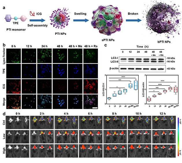 團隊進一步探索溶酶體功能變化與Aβ蛋白相分離之間的關系。通過ATRP合成pH響應骨架,將AIE染料四苯乙烯(TPE)共價接枝,并自組裝包載近紅外ACQ染料吲哚菁綠(ICG),形成AIE/ACQ協(xié)同的比率成像納米結構探針(PTI),實現(xiàn)AD自噬溶酶體酸化缺陷及其驅動的相分離過程的可視化“全流程”監(jiān)測。