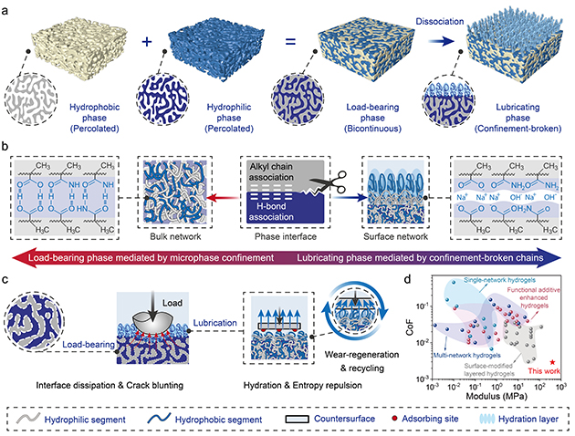 在人體關(guān)節(jié)中,軟骨依托多尺度膠原網(wǎng)絡(luò)、多相組分及其界面的協(xié)同作用,構(gòu)建出兼具高承載與超低摩擦的天然潤(rùn)滑系統(tǒng)。基于這一特性,水凝膠作為有潛力的人工軟骨替代材料備受關(guān)注。然而,傳統(tǒng)潤(rùn)滑水凝膠往往因結(jié)構(gòu)均一性而陷入兩難境地,提高整體網(wǎng)絡(luò)致密度雖能增強(qiáng)力學(xué)性能,卻會(huì)削弱表面水合與潤(rùn)滑能力;單純追求低摩擦,又會(huì)使材料在高載荷下迅速變形、蠕變甚至失效。這種長(zhǎng)期存在的性能權(quán)衡,嚴(yán)重制約了水凝膠在高載荷、長(zhǎng)壽命潤(rùn)滑場(chǎng)景中的實(shí)際應(yīng)用。