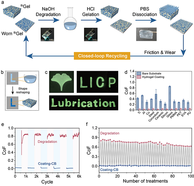 圖6.(a) 魯棒潤(rùn)滑系統(tǒng)的閉環(huán)回收示意圖。(b) 形狀重塑過程示意圖。(c) 制造的不同形狀水凝膠圖案(銀杏葉、研究所徽章“LICP”、文字“Lubrication”)。(d) 水凝膠涂層與相應(yīng)裸基底摩擦系數(shù)的對(duì)比。(e) 降解-重建循環(huán)過程中的摩擦系數(shù)曲線及(f)平均摩擦系數(shù)值對(duì)比(以玻璃為基底,“處理次數(shù)”以奇數(shù)次代表涂層、偶數(shù)次代表降解來表征)。