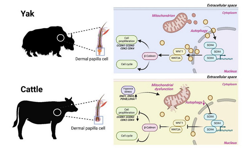 研究團隊進一步利用ATAC-seq與ChIP-qPCR發(fā)現(xiàn)了轉(zhuǎn)錄因子SOX4可直接結(jié)合WNT1與WNT3A基因的啟動子區(qū)域,且這一結(jié)合對基因的轉(zhuǎn)錄激活作用通過雙熒光素酶實驗得到驗證。SOX4的表達受自噬水平調(diào)控,激活自噬可挽救SOX4抑制劑對DP細胞增殖的抑制作用。該調(diào)控通路在牦牛體中表現(xiàn)出更強的信號活性,通過促進DP細胞周期進程、增強細胞增殖能力來維持毛囊穩(wěn)態(tài);同時,該通路還能改善線粒體結(jié)構(gòu)完整性以抵御氧化應(yīng)激,從而可能促進毛囊生長,系統(tǒng)性增強牦牛對高原寒冷環(huán)境的生存適應(yīng)能力??傊芯繄F隊從單細胞水平解析了牦牛毛囊適應(yīng)高原寒冷環(huán)境的分子特征,為理解動物對高原極端環(huán)境的適應(yīng)機制提供了重要基礎(chǔ)數(shù)據(jù)。
