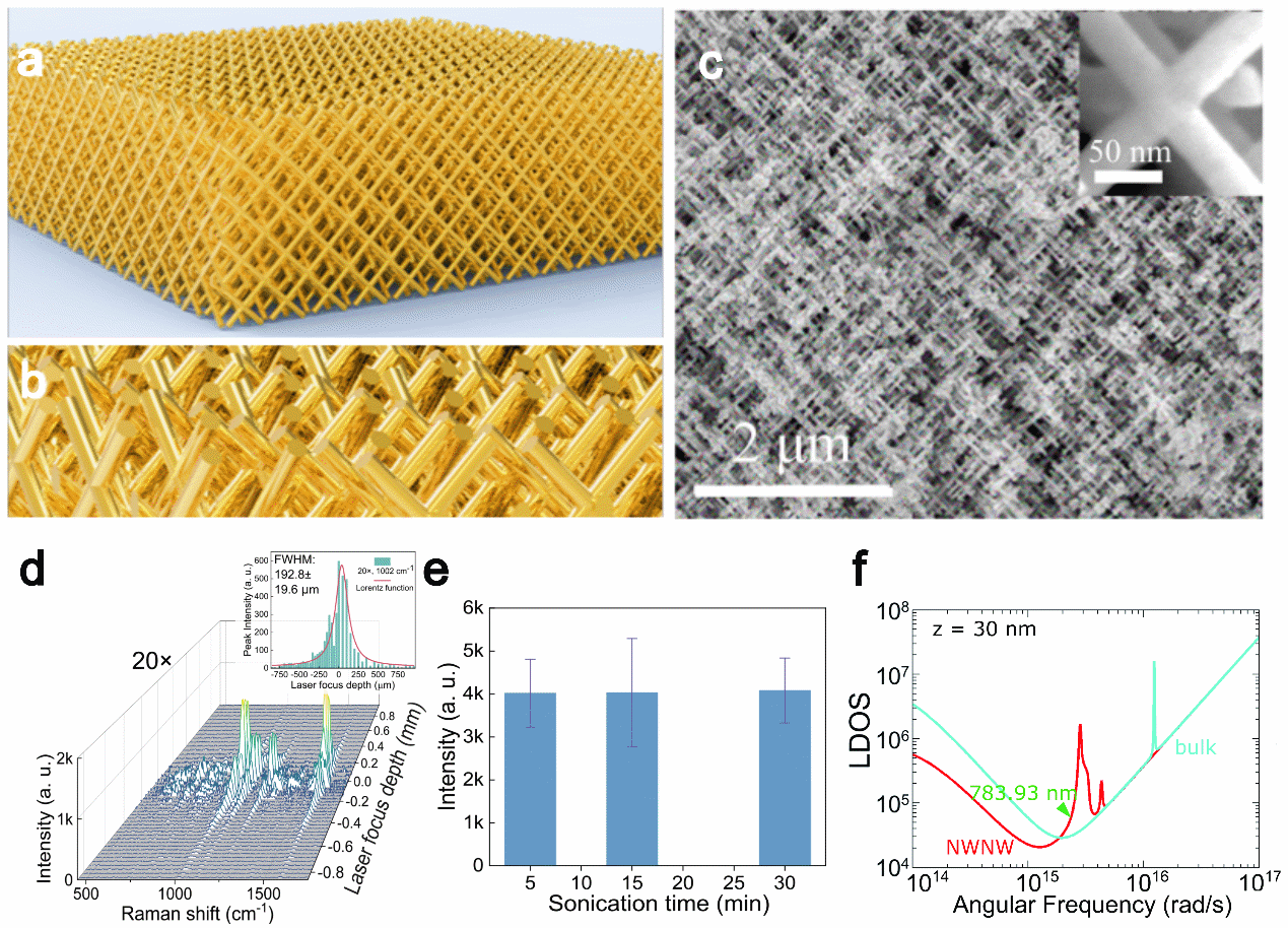 具有聚焦容忍性和結(jié)構(gòu)穩(wěn)定性的三維金納米網(wǎng)格SERS襯底:a-b基于離子徑跡技術(shù)制備的三維金納米線網(wǎng)格模型;c金納米線網(wǎng)格實(shí)物的掃描電鏡照片,納米線直徑為35 nm;d 三維襯底在20倍物鏡下能夠在離焦范圍192.8±19.6 μm內(nèi)保持50%SERS信號(hào);e 超聲水應(yīng)力環(huán)境SERS穩(wěn)定性測(cè)試,在30分鐘超聲后仍能保持信號(hào)穩(wěn)定;f 有效介質(zhì)模型反映出納米線網(wǎng)格結(jié)構(gòu)在激發(fā)光附近的高局域態(tài)密度。