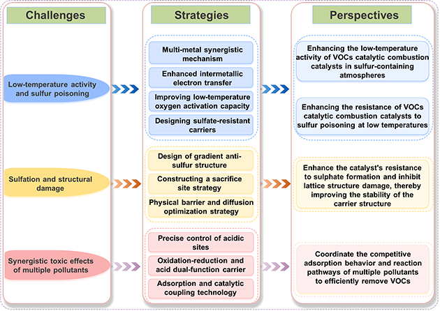 圖2. VOCs催化燃燒抗硫催化劑面臨的挑戰(zhàn)、當(dāng)前應(yīng)對策略及該領(lǐng)域發(fā)展前景