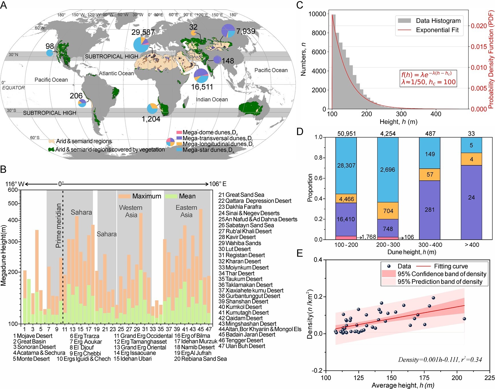 研究發(fā)現(xiàn),全球97%以上高大沙山集中于撒哈拉沙漠與亞洲干旱區(qū),充足沙源與強勁風力是沙山發(fā)育的基礎條件;澳大利亞沙漠因植被覆蓋度高、輸沙量有限,而未發(fā)育沙山。全球近91%的沙山高度介于100–200米,且以星狀沙山為主,表明多向風況更利于沙山的形成;高度超300米后以橫向沙山為主,超過400米的沙山僅有33座??臻g上,大陸內部沙丘場沙山平均高度更高且沙山密度隨沙山平均高度升高而顯著增加。