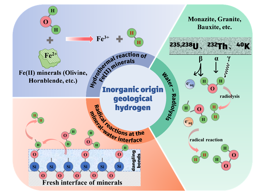研究指出,含F(xiàn)e(II)礦物水熱反應(yīng)、水輻射分解以及礦物-水界面自由基反應(yīng)是無(wú)機(jī)來(lái)源地質(zhì)氫的三種主要形成途徑,其全球年產(chǎn)氫率分別為0.2×1011–6.3×1012 mol/year,1.6×1010–1.35×1013 mol/year,和1.1×108–2.5×1010 mol/year。含F(xiàn)e(Ⅱ)礦物水熱反應(yīng)的核心機(jī)制是Fe(II)的電子轉(zhuǎn)移與礦物相變,主要受溫度控制;水輻射分解則通過(guò)天然放射性元素輻照水分解生成氫,主要受輻射類型和劑量影響;而礦物-水界面自由基反應(yīng)主要來(lái)源于界面水分子在不飽和配位位點(diǎn)反應(yīng)形成自由基并進(jìn)一步生成氫氣,其主要受礦物類型控制。上述反應(yīng)還受到共存離子、水溶氣體等地質(zhì)環(huán)境條件的共同調(diào)控。