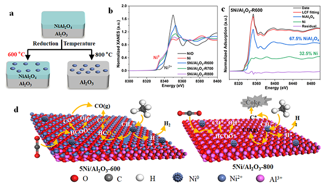 圖1.(a) Ni0/NiAl2O4/Al2O3制備示意圖; (b) 各還原溫度下的催化劑歸一化Ni K-edge XANES光譜;(c) 5Ni/Al2O3-R600的線(xiàn)性組合擬合(LCF)結(jié)果;(d)催化劑5Ni/Al2O3-600和5Ni/Al2O3-800的DRM反應(yīng)機(jī)理示意圖