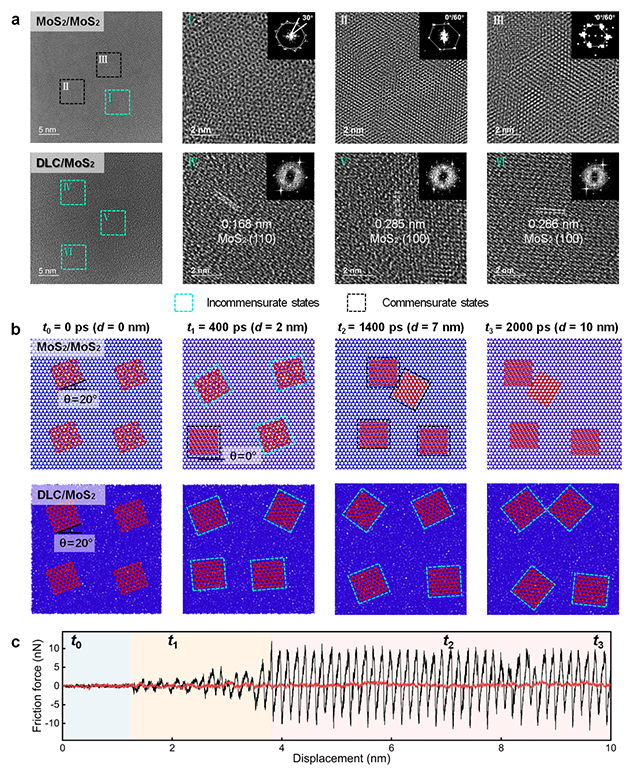 超潤滑工程尺度實(shí)現(xiàn)面臨三大核心挑戰(zhàn),即大尺度接觸面的隨機(jī)無序性導(dǎo)致超潤滑失控、高接觸壓力下界面形變導(dǎo)致超潤滑失效、大氣環(huán)境活性氣氛引發(fā)界面摩擦化學(xué)反應(yīng)導(dǎo)致超潤滑失穩(wěn)。針對上述挑戰(zhàn),研究團(tuán)隊(duì)從“宏觀接觸-微納界面-分子構(gòu)型-原子晶格”跨尺度結(jié)構(gòu)進(jìn)行逐級設(shè)計(jì)。首先,基于歸一化接觸思想,通過激光織構(gòu)構(gòu)建規(guī)則的接觸陣列,將宏觀面接觸歸一化為無數(shù)等同的微米級單元接觸,使每個(gè)單元的接觸狀態(tài)(面積、形狀、 受力等)保持一致,這樣界面潤滑材料在同一接觸狀態(tài)下結(jié)構(gòu)變化也趨于一致,整體變得可控(圖1);其次,在每個(gè)接觸單元表面構(gòu)筑剛性非晶類金剛石碳(DLC)膜層/柔性晶體MoS2配副滑移元界面,剛?cè)峤Y(jié)合有力削弱接觸界面在極端高接觸壓力下的形變;進(jìn)一步采用MXene作為增強(qiáng)與錨定劑,使晶體MoS2在極端高接觸壓力和大氣環(huán)境下保持完整的層狀結(jié)構(gòu),減少了缺陷與邊緣的不利影響,賦予其抵抗水分子和氧氣氧化能力,從而維持超潤滑界面的穩(wěn)定。最后,揭示了運(yùn)動(dòng)過程中原子晶格匹配的動(dòng)態(tài)偏轉(zhuǎn)微觀機(jī)制(圖2),即非公度態(tài)向公度態(tài)轉(zhuǎn)化,發(fā)現(xiàn)了非晶DLC/晶體MoS2永久非公度接觸特性,從根本上消除了晶格匹配所導(dǎo)致的原子互鎖。