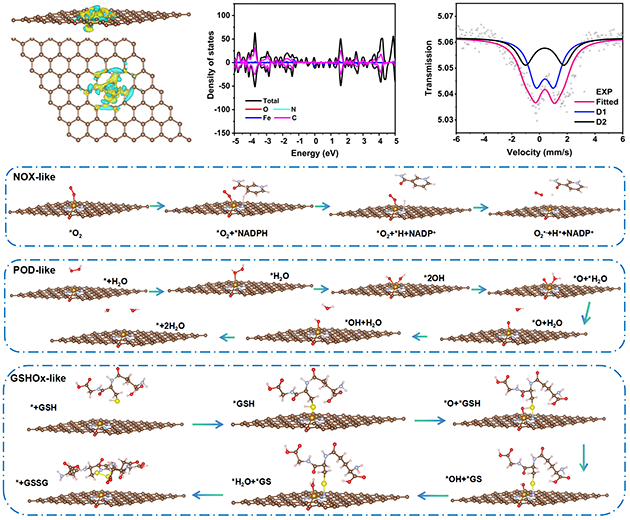 近日,中國科學(xué)院蘭州化學(xué)物理研究所天然藥物與化學(xué)測量研究中心海軍研究員團隊,發(fā)展了一種以氧化石墨烯為二維支撐載體的Fe單原子納米酶(FeNC SAzymes)。與傳統(tǒng)平面Fe-N4構(gòu)型相比,軸向O配位的引入有效打破了對稱配位限制,增強了活性中心的電子調(diào)控能力(圖1)。此外,密度泛函理論計算解析該關(guān)鍵活性能有效降低多酶反應(yīng)途徑的能量勢壘,從而提升NOX、POD和GSHOx等多酶樣級聯(lián)相關(guān)過程的反應(yīng)效率,為后續(xù)觸發(fā)后放大效應(yīng)提供基礎(chǔ)(圖2)。FeNC SAzymes結(jié)構(gòu)設(shè)計使Fe中心的電荷分布和d軌道電子態(tài)密度得到優(yōu)化,從而提升其對反應(yīng)中間體的吸附與活化能力以及電子轉(zhuǎn)移效率,為實現(xiàn)TME識別、可視化檢測和響應(yīng)研究提供了新方法。