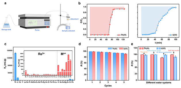 近期,研究人員進(jìn)一步通過(guò)調(diào)控羧基位點(diǎn)數(shù)量和孔腔環(huán)境,構(gòu)筑了PTA-TPPEE、BTC-TPPEE和PMA-TPPEE三種單晶材料(圖6),其中PTA-TPPEE表現(xiàn)出最優(yōu)的Th(IV)/U(VI)捕獲性能,其對(duì)Th(IV)和U(VI)的吸附可在1 min內(nèi)達(dá)到平衡,最大吸附容量分別達(dá)到582.0和325.7mg/g-1。進(jìn)一步研究表明,PTA-TPPEE兼具開放的傳質(zhì)通道和穩(wěn)定的剛性骨架,在鹽湖鹵水、稀土礦廢水等復(fù)雜水體系中對(duì)Th(IV)和U(VI)的去除率分別保持在98%和95%以上,循環(huán)使用5次后仍保持91%的去除率,表明PTA-TPPEE在從核廢水溶液中分離Th(IV)/U(VI)方面具有實(shí)際應(yīng)用潛力(圖7)。多實(shí)驗(yàn)表征結(jié)合理論計(jì)算分析進(jìn)一步揭示,羧基與目標(biāo)分析物之間的配位作用是實(shí)現(xiàn)高效吸附的關(guān)鍵,而羧基數(shù)目、骨架剛性及局部電荷環(huán)境的協(xié)同優(yōu)化則共同決定了材料對(duì)Th(IV)和U(VI)的快速傳質(zhì)、高容量捕獲與選擇性分離行為。相關(guān)研究成果發(fā)表在Science China Chemistry(DOI:10.1007/s11426-025-3032-9)上(圖8)。