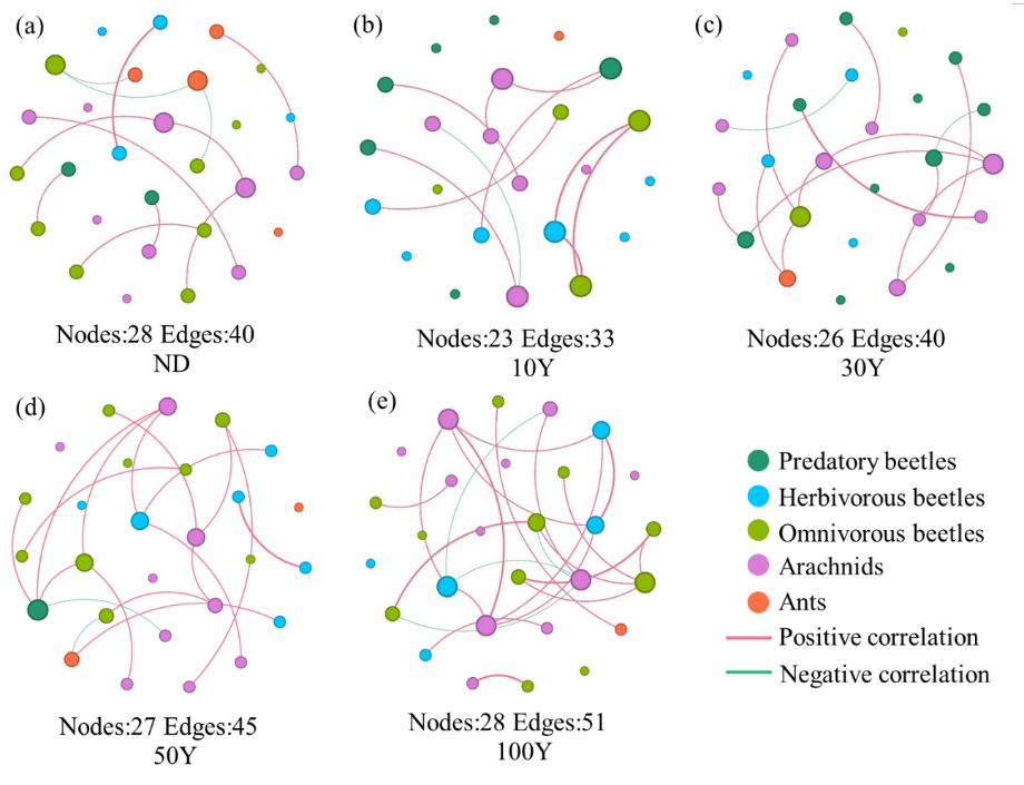 天然荒漠、10年、30年、50年和100年農(nóng)田不同營養(yǎng)級(jí)地表節(jié)肢動(dòng)物的共線性網(wǎng)絡(luò)