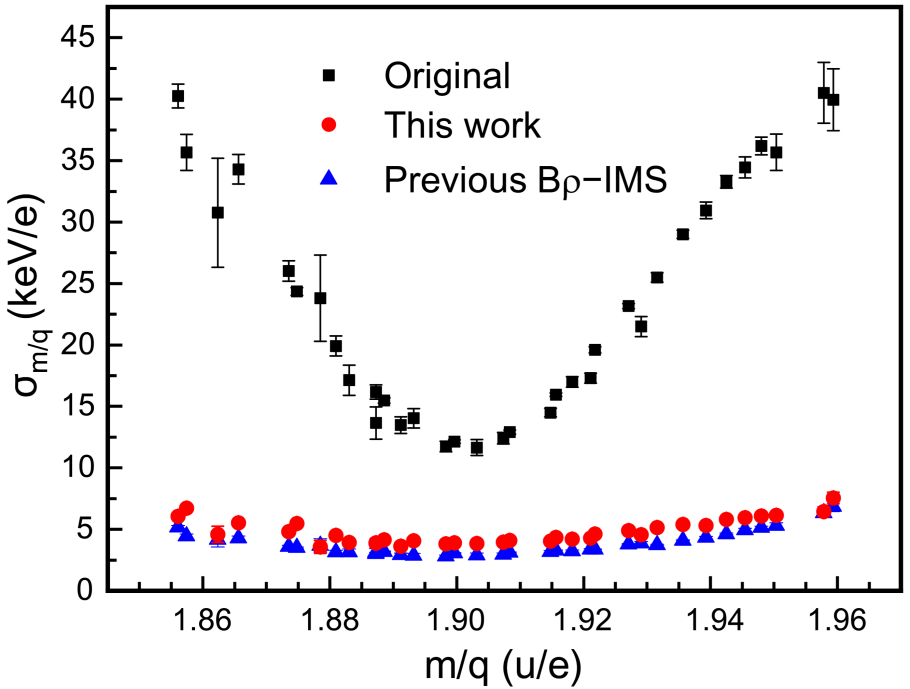 圖:本方法(紅點)與之前Bρ-IMS(藍點)給出的質(zhì)荷比(m/q)標(biāo)準(zhǔn)差的對比。黑點為傳統(tǒng)等時性質(zhì)譜術(shù)(未進行磁場修正)的結(jié)果