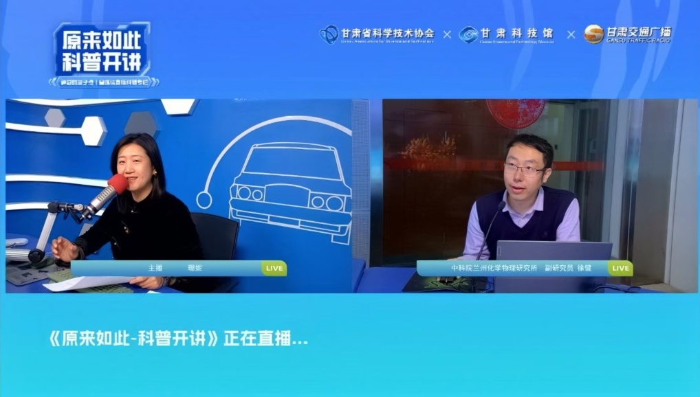 12月13日,中國科學院蘭州化學物理研究所徐健副研究員受邀在甘肅交通廣播《原來如此—科普開講》欄目開展了線上直播科普講座。