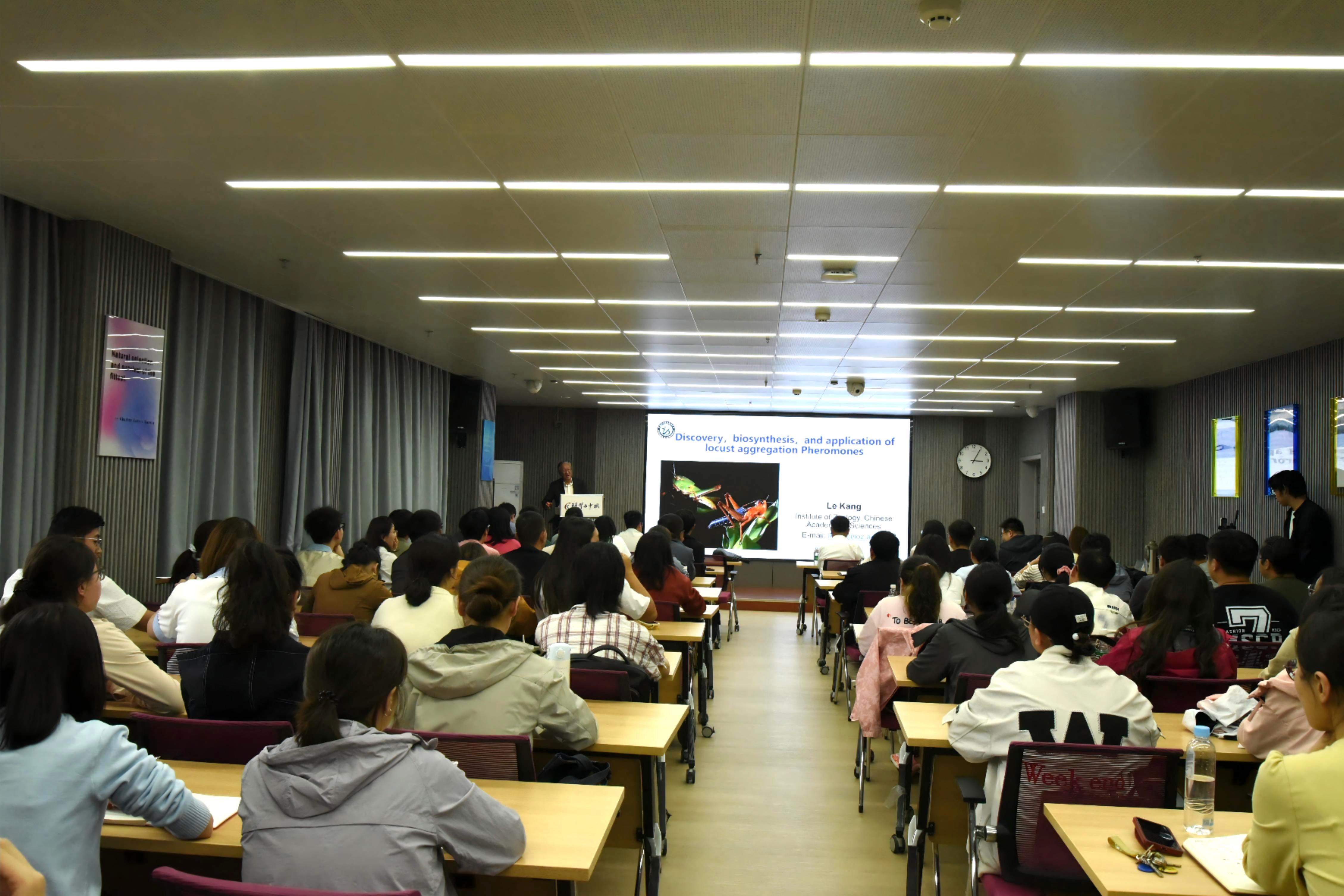 講座環(huán)節(jié),康樂院士詳細闡述了蝗蟲群聚信息素的發(fā)現研究過程和注意細節(jié),從基礎理論到應用實踐,層層剖析,向大家講解了蝗蟲群聚信息素的發(fā)現、生物合成和應用,生動的講解了蝗蟲群聚信息素4-乙烯基苯甲醚(4VA)在蝗蟲體內產生的過程,以及蝗蟲利用植物中常見的氨基酸來合成自己特異的群聚信息素?;趯?VA生物合成途徑的解析,康樂院士研究團隊設計出一種小分子抑制劑,能夠精準調控4VA的合成和釋放,從而有效干預蝗蟲的群聚行為。為蝗災“綠色防控”提供了全新技術方案,為開發(fā)與利用昆蟲信息素實現精準調控害蟲行為提供了新的思路,推動了害蟲綠色可持續(xù)防控的發(fā)展。