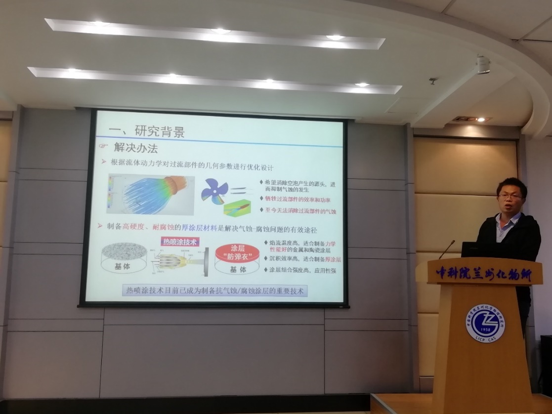 劉士民博士介紹了鋰離子電池電解質(zhì)及單鋰固體導(dǎo)電聚合物(SLiPC) 的研究進(jìn)展,以及他本人基于聚氨酯基的三種SLiPC合成、性質(zhì)、性能以及構(gòu)效關(guān)系方面的研究工作。侯國(guó)梁博士針對(duì)航空發(fā)動(dòng)機(jī)燃油蝸殼、輪船的螺旋槳和水輪機(jī)葉片等眾多過流部件存在的嚴(yán)重氣蝕/腐蝕問題,開展的多種熱噴涂涂層的氣蝕/腐蝕性能研究。馬鵬軍博士針對(duì)超級(jí)電容器在低溫條件下電化學(xué)性能不佳的問題,采用外部加熱的方式,巧妙地將具有較高光譜選擇性吸收特性的尖晶石型光-熱轉(zhuǎn)化涂層構(gòu)筑到超級(jí)電容器器件表面。張耀明博士介紹了其基于聚合誘導(dǎo)自組裝(PISA)法制備多種嵌段共聚物納米結(jié)構(gòu),并實(shí)現(xiàn)其形貌演化的可控調(diào)控方面的研究工作,以及基于PISA法制備的刺激-響應(yīng)性聚合物在可控潤(rùn)滑材料中的應(yīng)用等工作。報(bào)告結(jié)束后,王紅利副研究員向四位報(bào)告人頒發(fā)了榮譽(yù)證書。