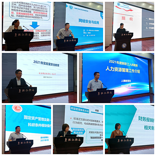 此次教育培訓(xùn)分為業(yè)務(wù)培訓(xùn)和專題培訓(xùn),業(yè)務(wù)培訓(xùn)主要由所務(wù)辦公室、黨委辦公室、科研與規(guī)劃處、人事教育處、財務(wù)處、條件保障處、公共技術(shù)中心等分別就所情所況、黨建、論文發(fā)表、人事人才、財務(wù)制度與報銷管理流程、固定資產(chǎn)管理與政府采購、公共設(shè)施使用與行為規(guī)范、公共平臺建設(shè)與運維等進行了介紹。專題培訓(xùn)主要包括實驗室安全教育、網(wǎng)絡(luò)安全與應(yīng)用、保密教育、質(zhì)量管理體系建設(shè)與運行、館藏文獻與數(shù)據(jù)庫應(yīng)用等,并就質(zhì)量管理體系和安全教育培訓(xùn)組織了考試。