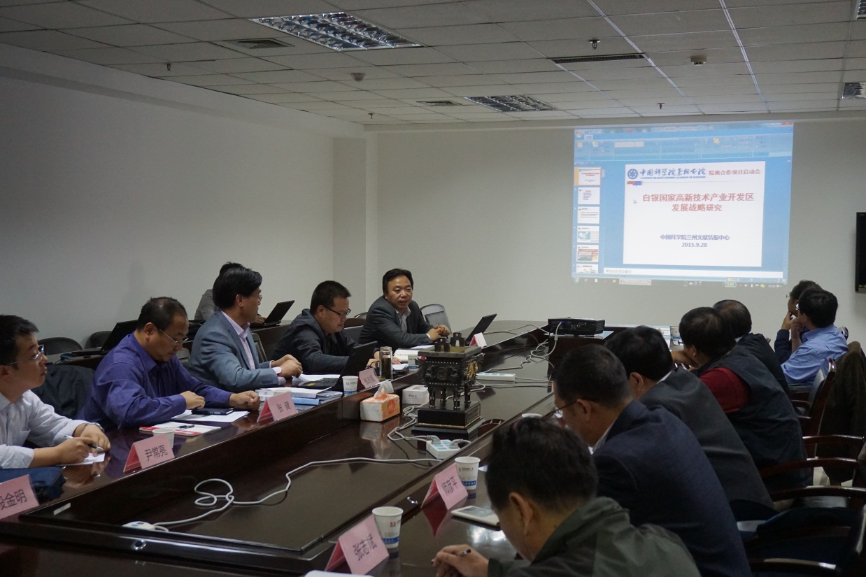 9月28日,“白銀國家高新技術(shù)開發(fā)區(qū)創(chuàng)新發(fā)展戰(zhàn)略研究”項(xiàng)目啟動會在中國科學(xué)院蘭州文獻(xiàn)情報中心召開,來自甘肅省政府研究室、中科院蘭州分院、中科院近代物理研究所、中科院蘭州化學(xué)物理研究所、西北師范大學(xué)、白銀國家高新技術(shù)開發(fā)區(qū)等單位的十位專家對項(xiàng)目研究方案進(jìn)行了深入咨詢。會議由蘭州文獻(xiàn)情報中心主任張志強(qiáng)研究員主持,中國科學(xué)院蘭州分院副院長楊青春、院長助理張健以及院地科技合作處負(fù)責(zé)人等參加了會議。