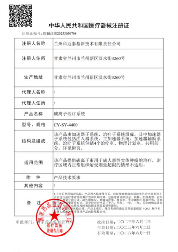 圖1:碳離子治療系統(tǒng)醫(yī)療器械注冊(cè)證