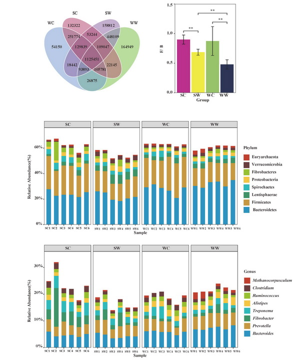 圖1(a)不同環(huán)境下藏野驢腸道菌群基因數(shù)目花瓣圖;在門(mén)水平(b)和屬水平(c)上,藏野驢腸道菌群相對(duì)物種豐度直方圖;(d) F/B值的分析
