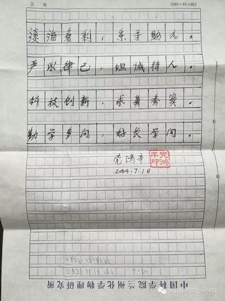 2004年7月10日,黨鴻辛躺在醫(yī)院病床上,在標(biāo)識(shí)有“中國(guó)科學(xué)院蘭州化學(xué)物理研究所”字樣的一張稿紙上寫下遺訓(xùn):