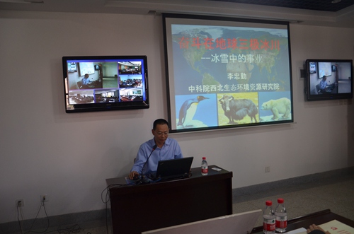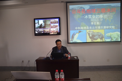 李忠勤結(jié)合自己在高寒極端環(huán)境無私奉獻(xiàn)30年的難忘工作經(jīng)歷,為與會人員深情講述了他《奮斗在地球三極冰川》的感人故事。他的報告分“北極科學(xué)考察介紹”、“走進(jìn)南極”和“中國冰川定位觀測”三個部分,通過普及地球三極(南極、北極和青藏高原)知識、梳理回顧世界及中國冰川科考?xì)v史、介紹中國冰川科考站情況及科考隊感人事跡,為大家作了一場生動、感人的報告,一幅幅珍貴難得的實地照片再現(xiàn)了冰川科考工作的極端艱辛,一句句深情感人的樸實語言展示了共產(chǎn)黨人無私奉獻(xiàn)的政治品格。同時,他強(qiáng)調(diào)指出,他所在的科研團(tuán)隊結(jié)合冰凍圈科學(xué)研究以野外工作為基礎(chǔ),具有人員分散、工作辛苦等特點的實際,制定了以黨小組為單元,研究室支部、所黨委聯(lián)動的“兩學(xué)一做”方案,以科研工作為載體和抓手,深入扎實推進(jìn)“兩學(xué)一做”學(xué)習(xí)教育,取得了良好效果,發(fā)揮了黨支部是戰(zhàn)斗堡壘作用。他的報告圖文并茂,真實感人,既是一場科普報告,更是一場生動黨課,受到與會人員歡迎和好評。